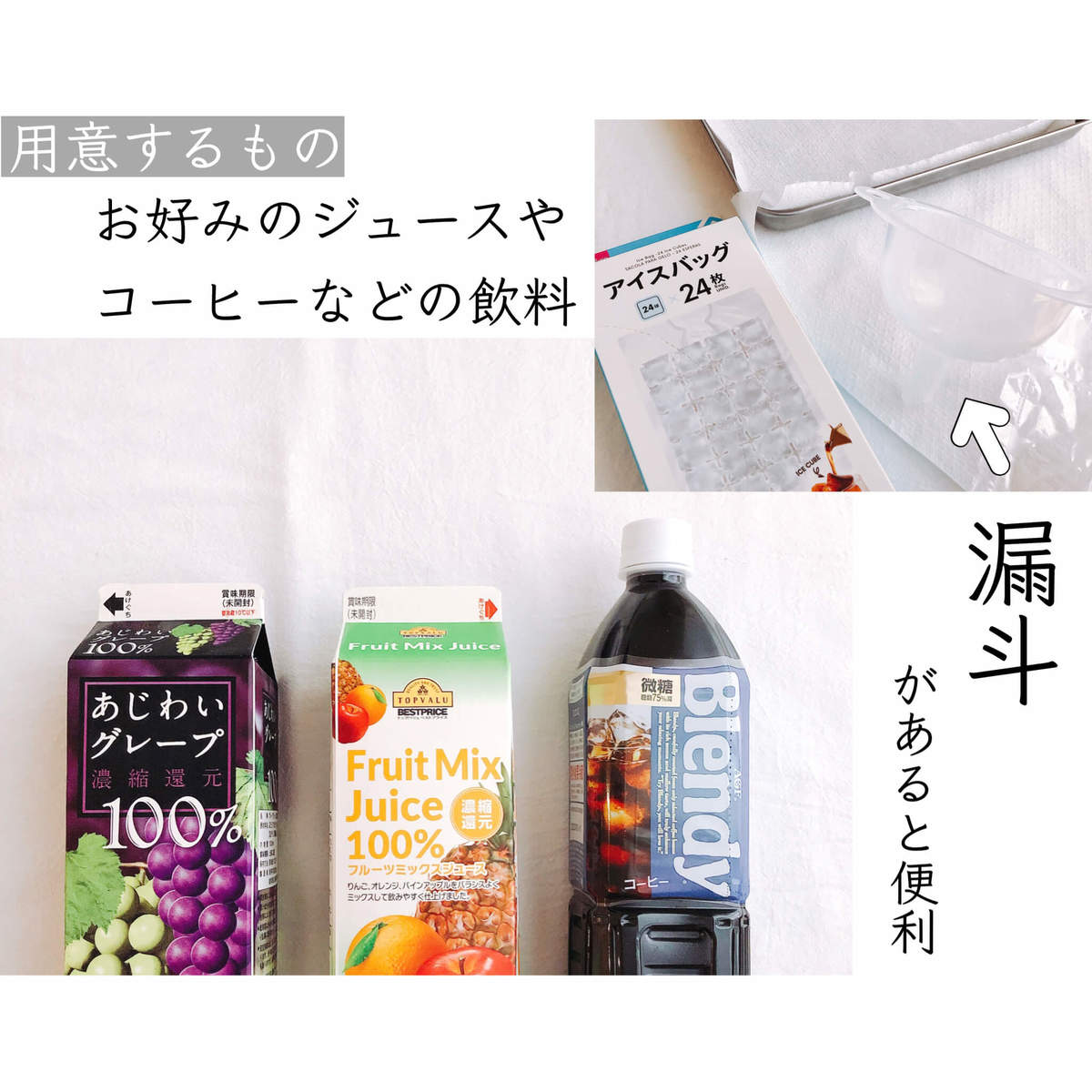 用意するものは、お好みのジュースやコーヒーなどの飲料です。
