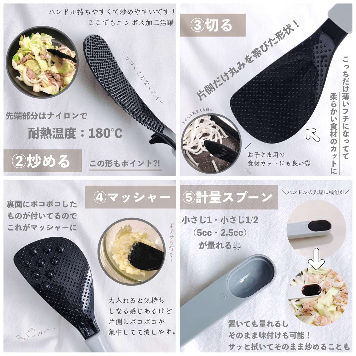 先端部分はナイロン製になっていて耐熱温度は180℃です。ハンドルが持ちやすいので炒めやすい!