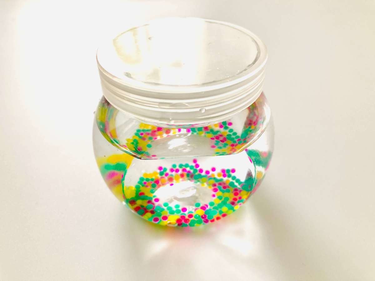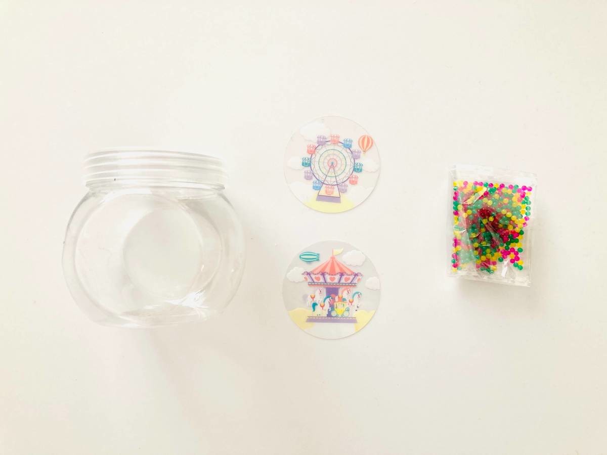 ボトルにジェリービーズと6分目までの水を入れて、5時間くらい放置します。すると中のジェリービーズが水を吸ってふくらんできます。我が家では3時間くらいでちょうど良い大きさになりました!