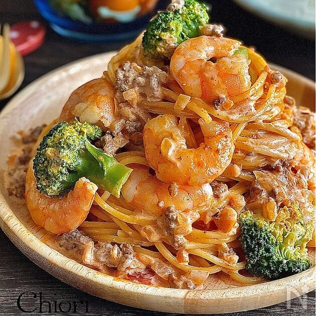 海老とブロッコリーのミートクリームパスタ