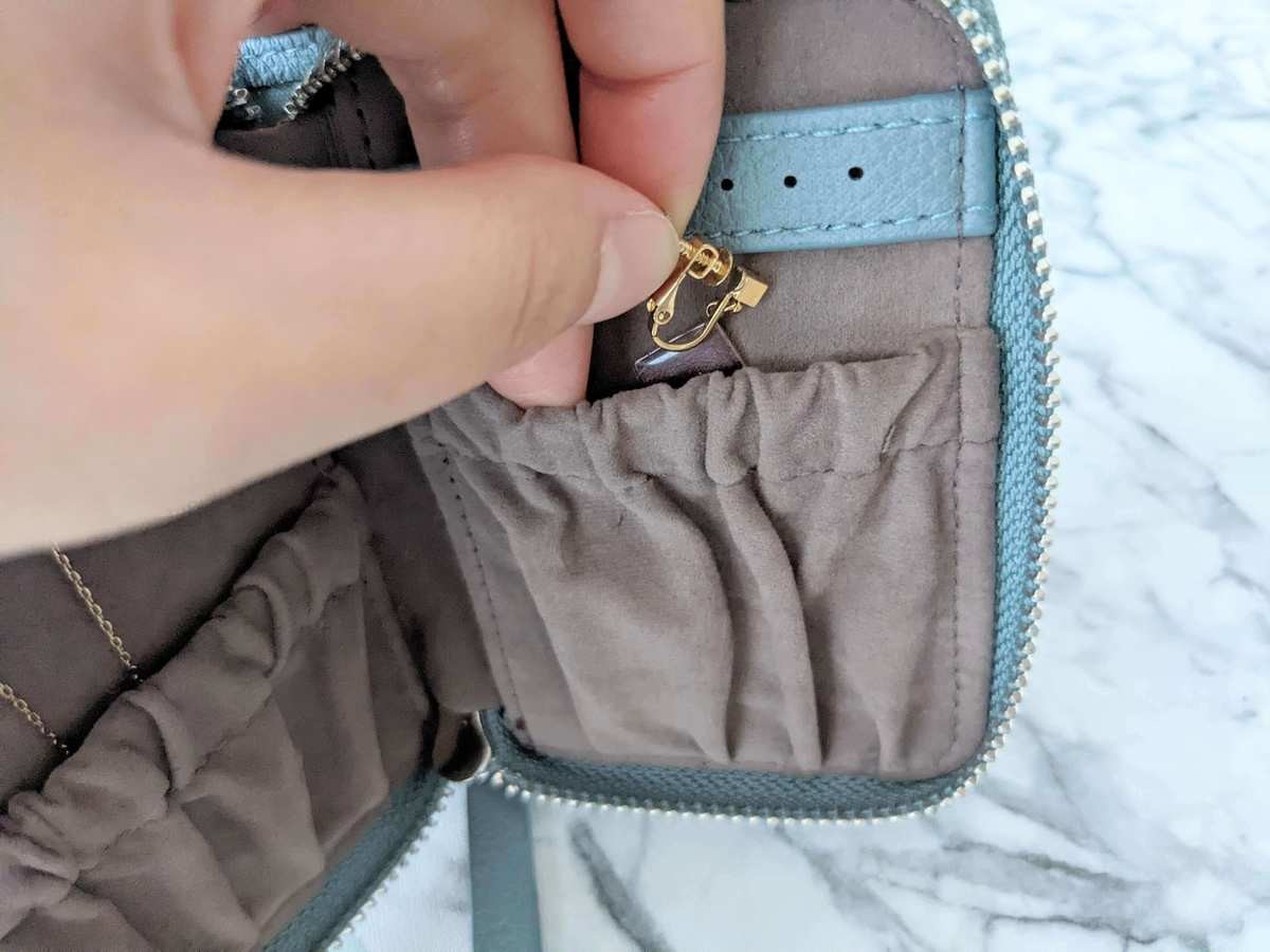 左側にはピアスホルダーがあるのですが、私はイヤリング派なので下のポケットにIN。 ゴム入りなので中身が飛び出しにくいところも◎です。