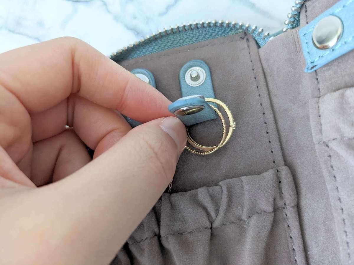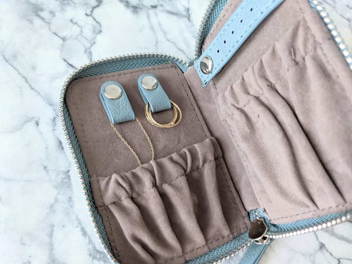 リングやネックレスは、こちらに収納することで絡まりや紛失を防ぐことができます。 スナップボタンで留められるため、移動中に中身がごちゃごちゃになることもありません。