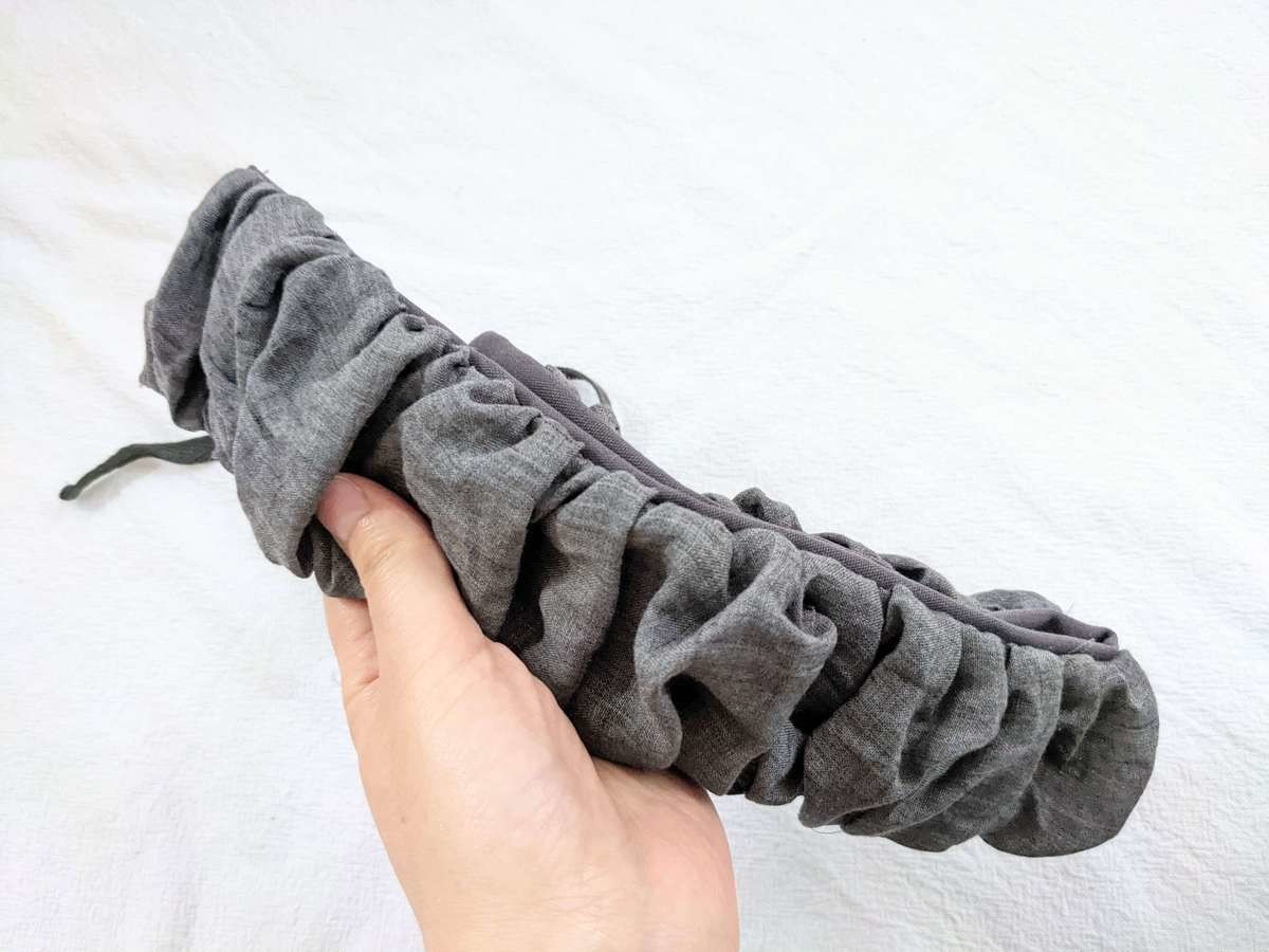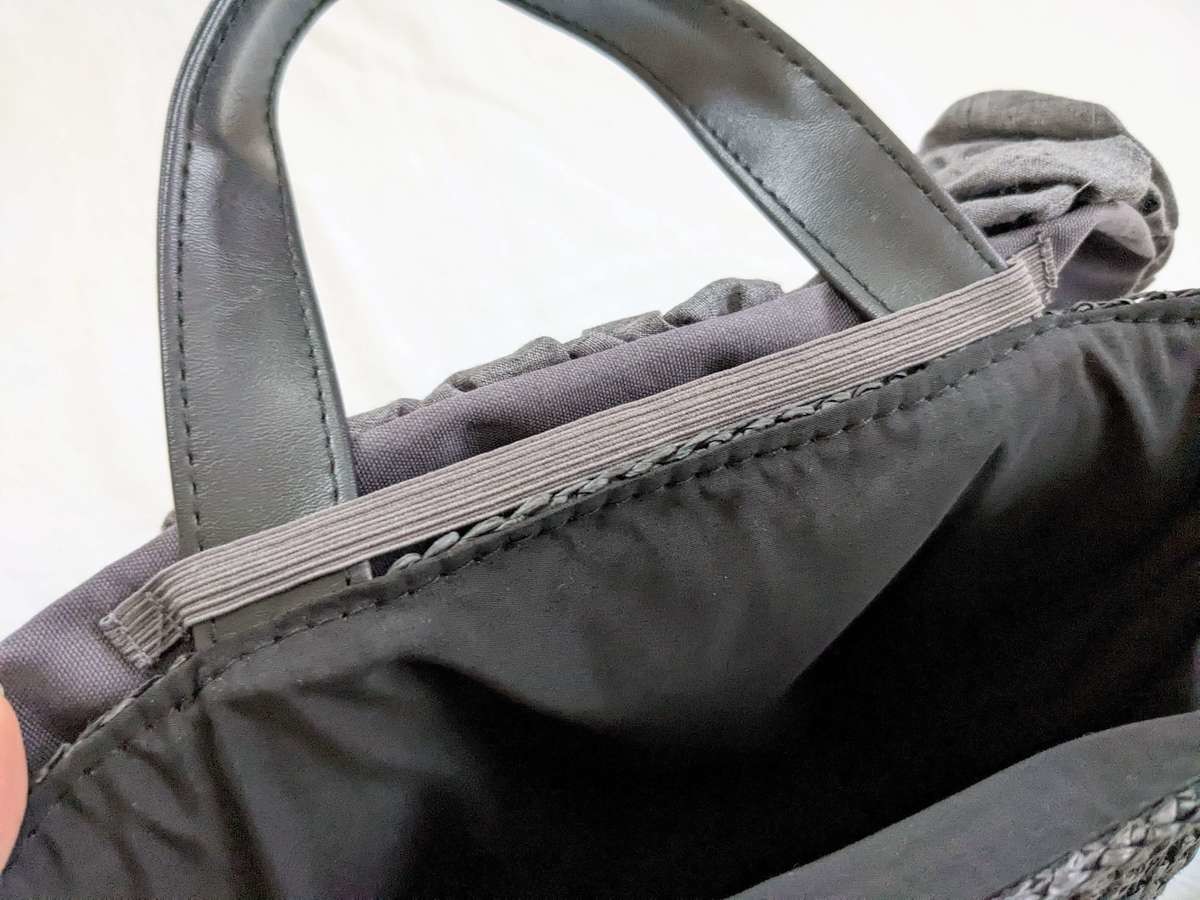 使い方はとても簡単です。 フチカバーの裏側にゴムがあるため、バッグの持ち手をここに通します。