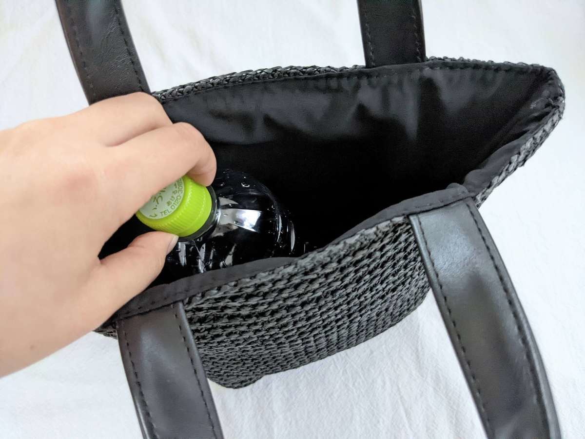 小ぶりサイズでも高さがあるため、500mlのペットボトルがすっぽり入ります。 マチがあるため収納力もバッチリです。