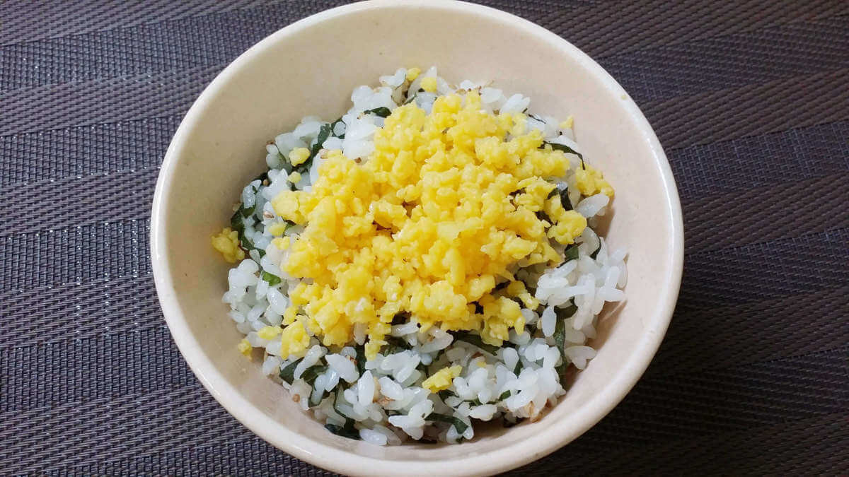 甘く味付けした炒り卵をのせてみました。大葉ご飯のさわやかさに甘い炒り卵がマッチして子どもがよろこびそうな味に。