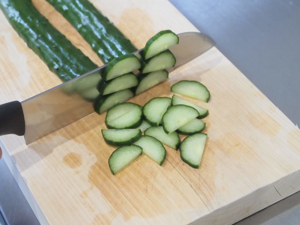 きゅうりの両端のヘタを切り落としたら、縦半分にカットします。今回、端から半月切りにしました。