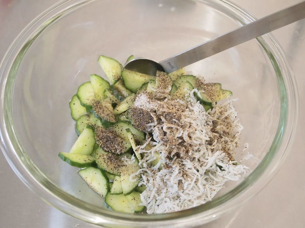 ボウルにきゅうりとしらす、残りの材料を入れ、よく和えます。
