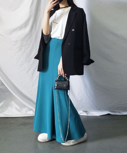 ・スリットが入った薄手のマーメイドスカートできれいめ仕上げ