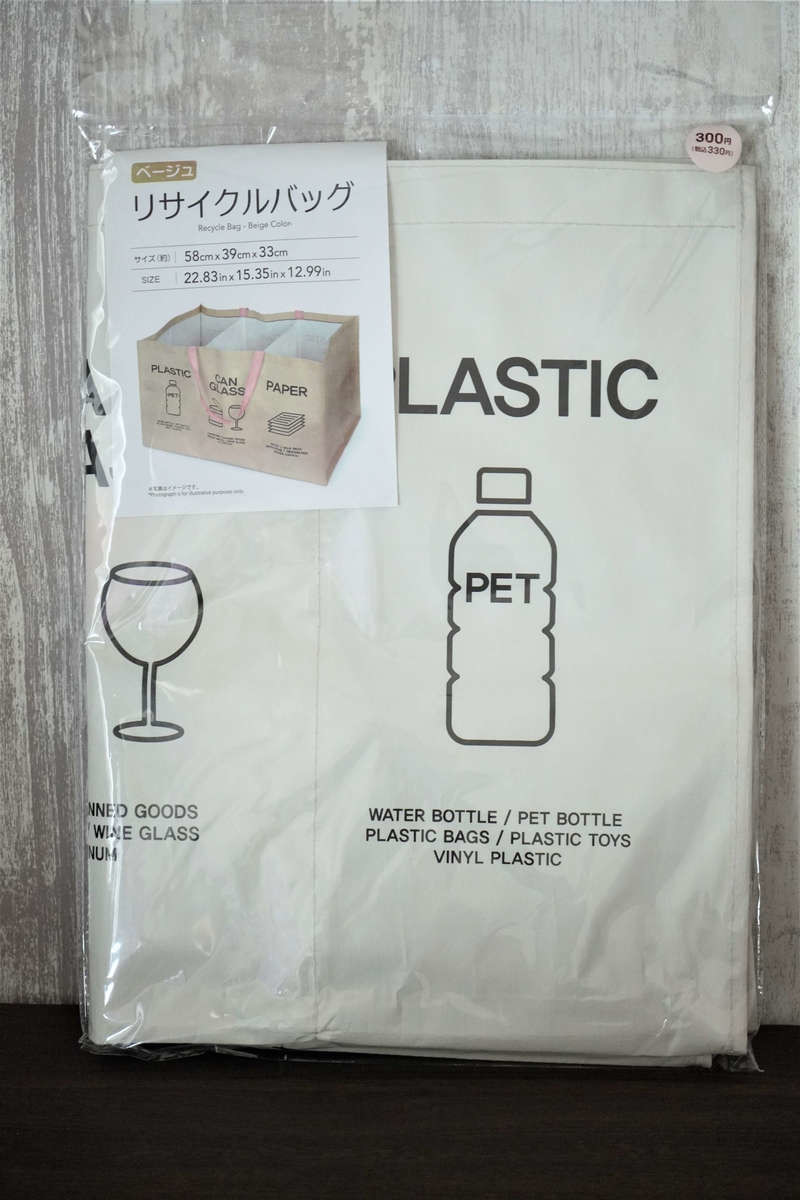 こちらはプラスチック・缶、グラス・紙類の3つのゴミを1つのバッグで分別ができるリサイクルバッグです。