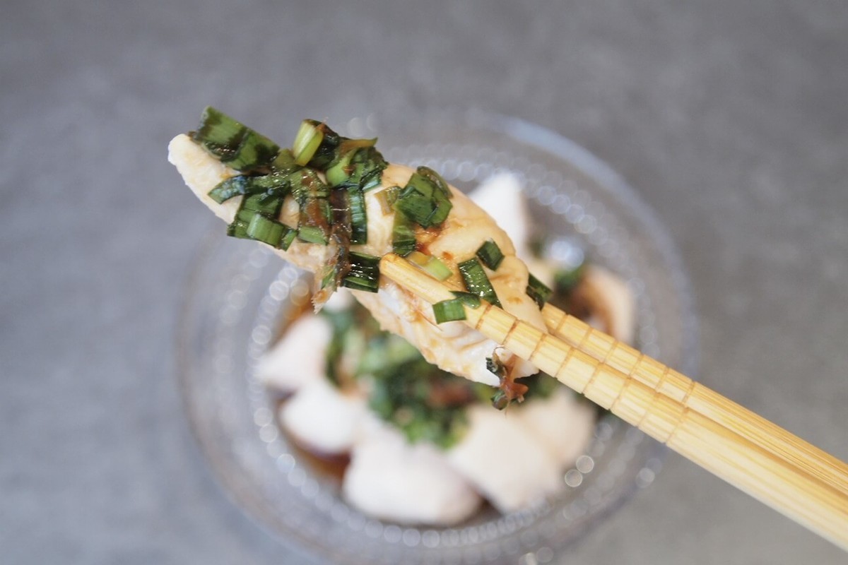 一口食べると、ニラだれの旨味と鶏ささみのやわらかさにびっくり!まさにふわふわという表現がぴったりな食感で、とてもやわらかくしっとり仕上がっていました。