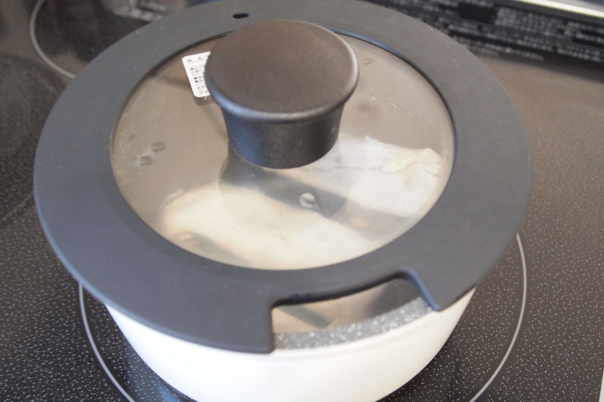 鍋にお湯を入れ、沸騰したら火を止めて鶏ささみを加えます。すぐに蓋をして3分ほど放置し、火を通します。