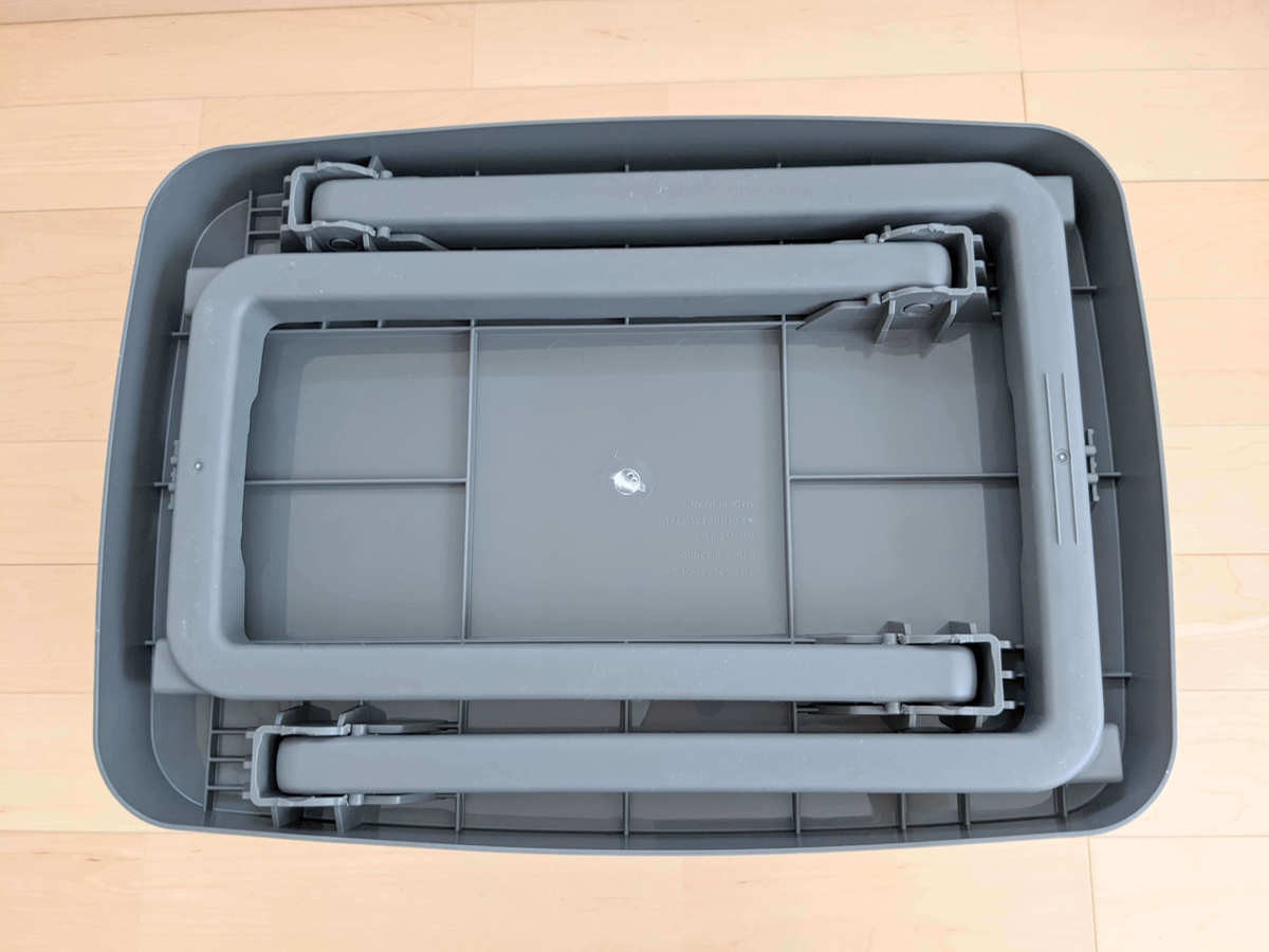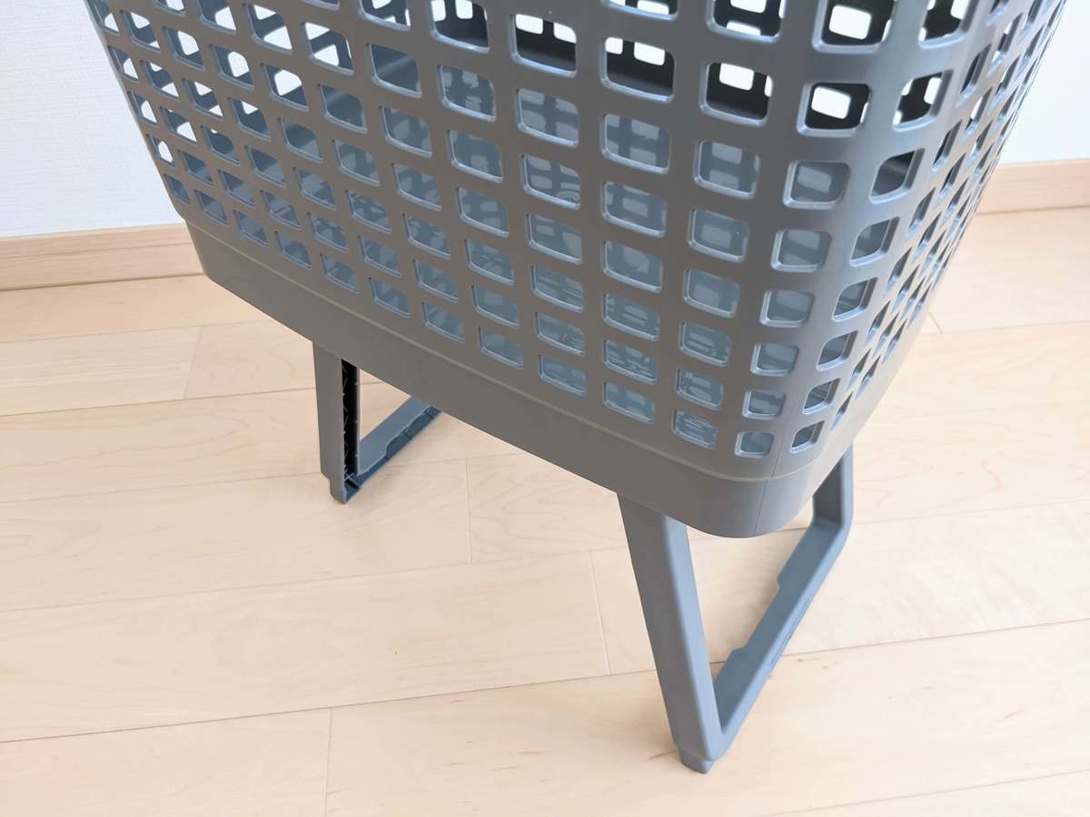 腰らくバスケットの底を見ると、このように収納式のスタンドが付いています。 そのため、このスタンドを広げることで高さを出すことができるんです。