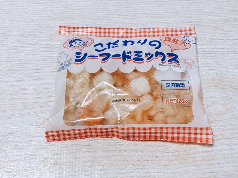 内容量:120g イカ・ほたて・えびの3種類をミックスした、お買い得なシーフードミックスです♪ 魚介類をスーパーで買い揃えると、なかなかの値段がするので、200円ちょっとで買えるシーフードミックスはめちゃくちゃく重宝します! こちらを使って、先日八宝菜を作りました♪