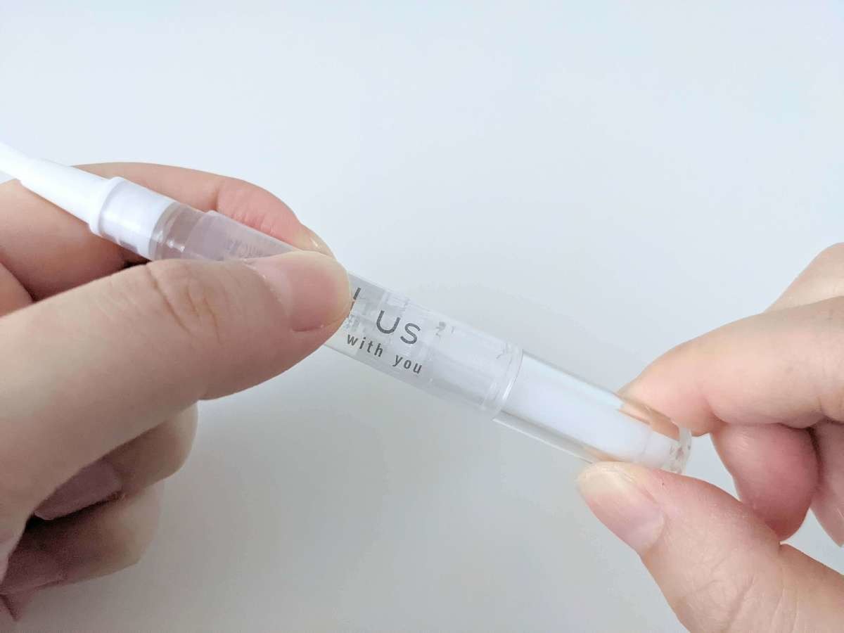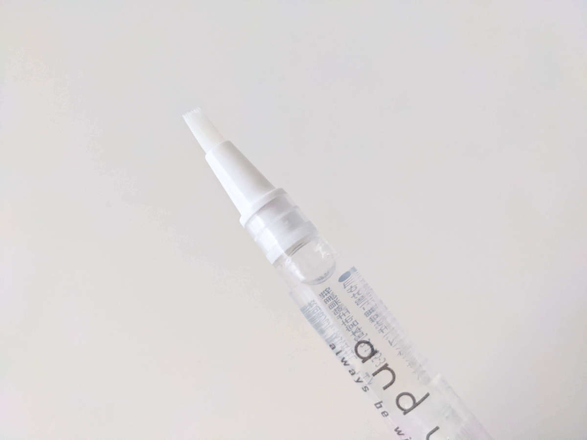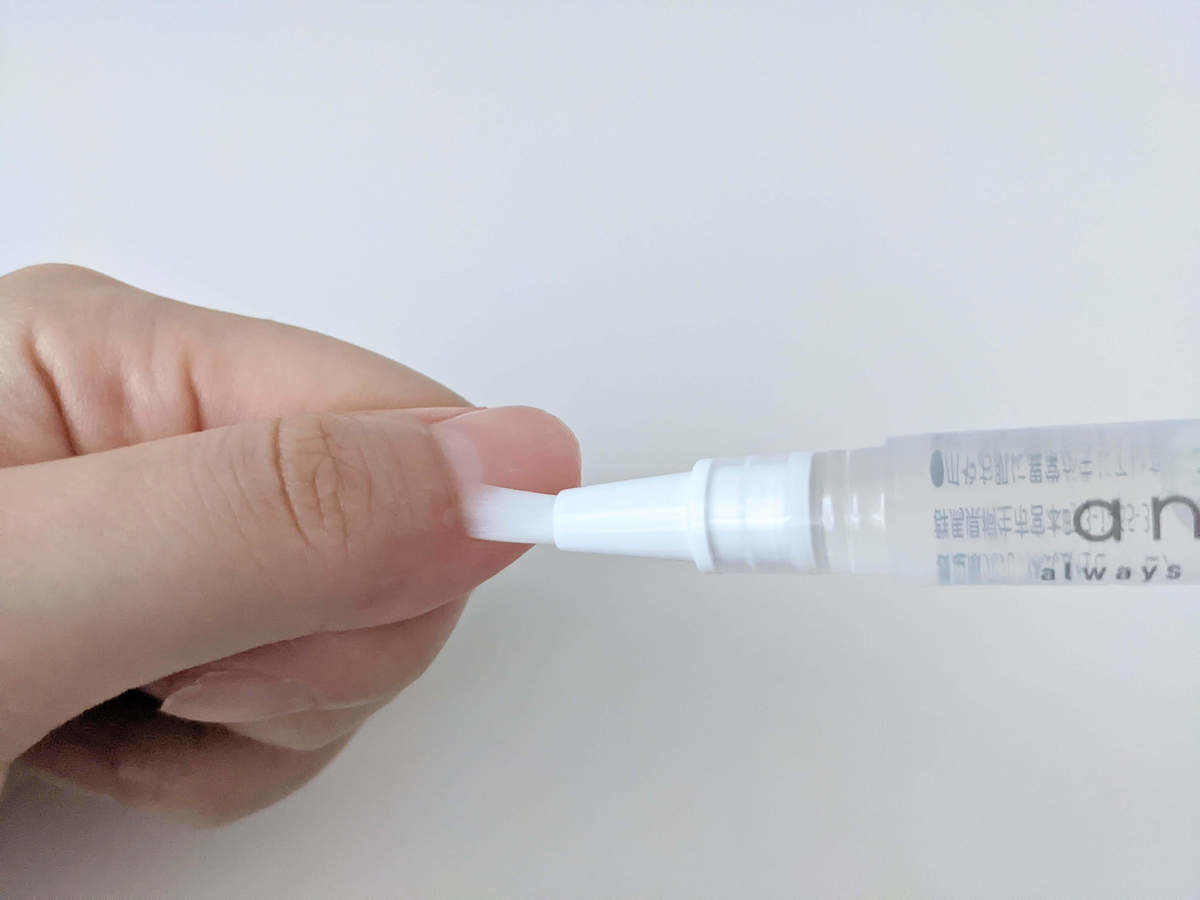 爪まわりにオイルを塗り、爪全体に馴染ませます。 ダイヤル式で量を調整できるため使いやすく、また筆も塗りやすいです。