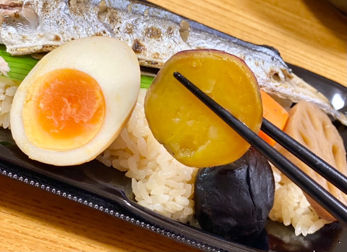 さつまいもや味付けたまごなどの付け合わせにも味がしっかりとついていて、ボリューム満点なのに飽きずに完食できます。
