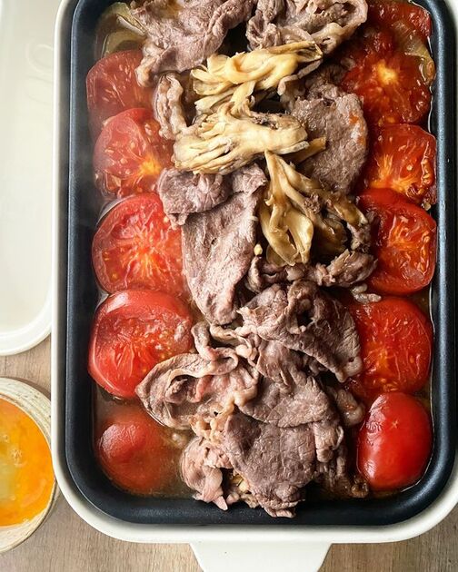 ちょっぴり手を抜きたい時にもオススメ、夏のすき焼きです。トマトのサッパリとした酸味が甘辛醤油と相性◎。できたてのアッサリ味と、グツグツ煮立てた味染み状態、ぜひ両方を食べ比べしてみてくださいね。