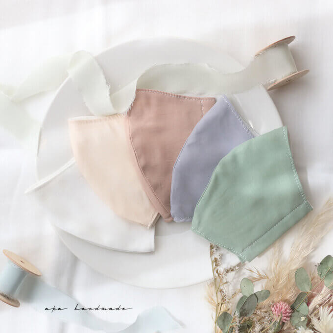 こちらの作品は、ホワイト/ベージュ/スモーキーピンク/グレー/カーキグリーンの5色展開です。裏側の生地は、マスク内の温度を下げる効果があり、快適な使い心地です。お子さまから男性まで、幅広いサイズが揃っているので、ご友人やご家族とお揃いや色違いで付けるのもいいですね。