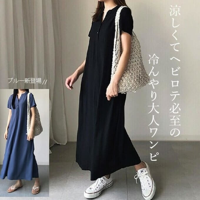 デコルテ周りがすっきり見え、着痩せ効果も抜群のアイテム「半袖ワンピース」です。ブラックカラーなので、バッグなどの小物とも合わせやすいのがいいですね。ちょっとそこまでのお出掛けや、海やプールにも大活躍しそうな1枚です。