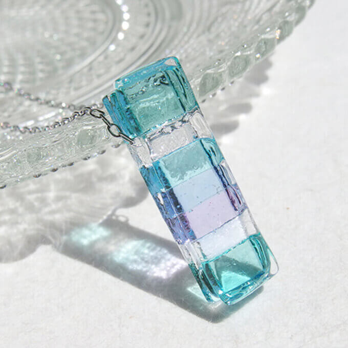 こちらの作品は、チェーンの種類を選ぶことができます。紐や、金属アレルギーの方はシルバー925に変更するのもおすすめです。チェーンは一般的なネックレスの長さの40cmです。クリアカラーが日光に当たってキラキラと輝くので、夏にぴったりのネックレスですよ。