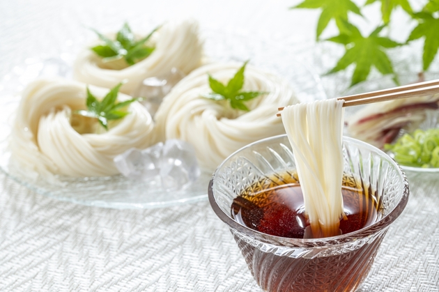 水で洗うだけだと、そうめんが冷え切らず、おいしさが半減してしまいます!水で洗い終わった後は、手でギューッと麺を握り、しっかり水気を切って下さい。