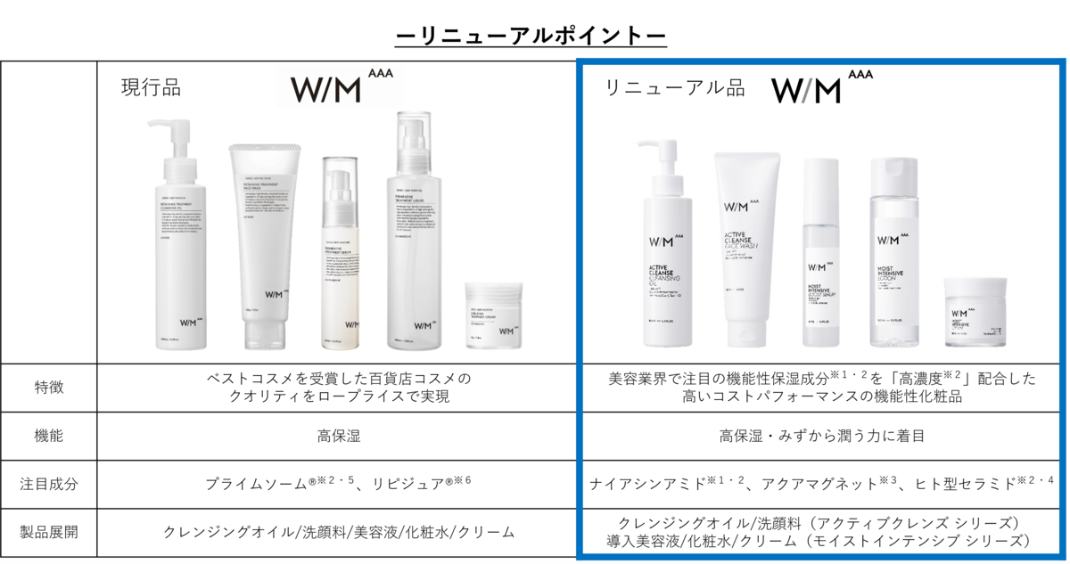 今回ご紹介するのは、マツキヨココカラ&カンパニーで人気のプライベートブランド 「matsukiyo W/M AAA」がパワーアップリニューアルした、「W/M AAA(ウーマン メソッド トリプル A)」スキンケアライン。