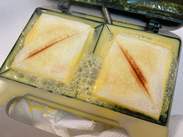 わが家はコンセント電源式なので途中の焼き色を見ながら加熱しました。焼き目がつきパン同士がしっかりくっついたら出来上がりです♪