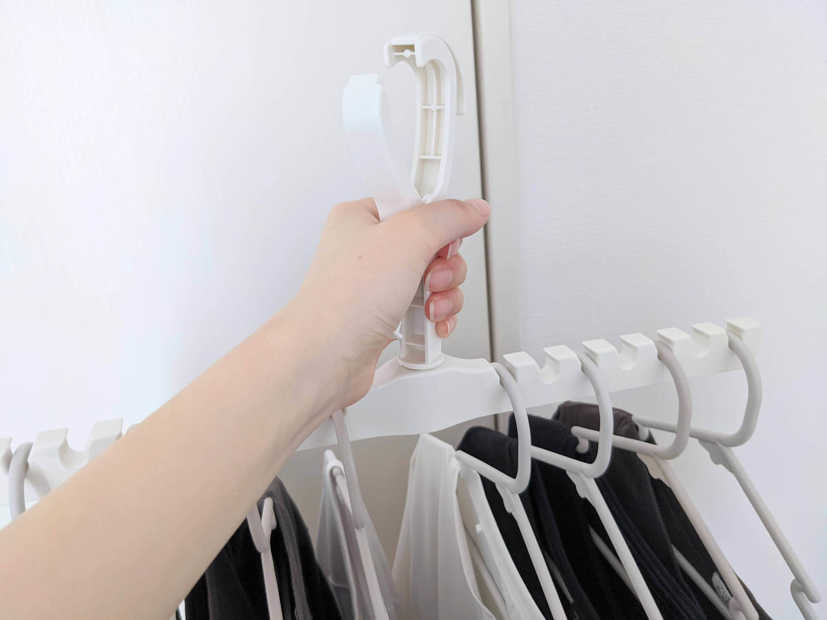 ハンガーを掛けすぎると重くなってしまうため、洗濯物がそれほど多くないときは7~8本におさえています。 ちなみに外干しする際は、直径2.5~4cmの物干し竿に対応しています。