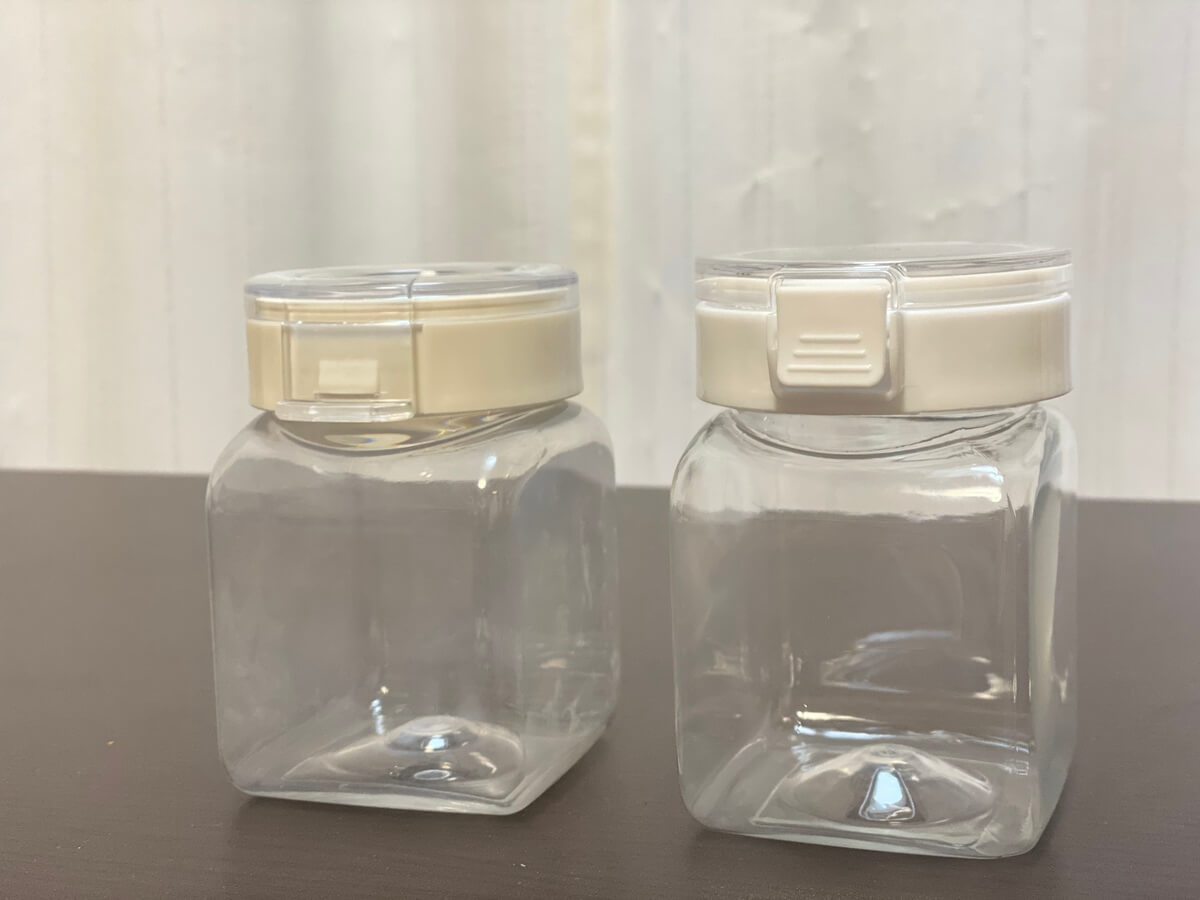 こちらは、ダイソーで販売している調味料やパスタなどの収納に便利な“Pure Pot ピュアポット”1個110円(税込)。