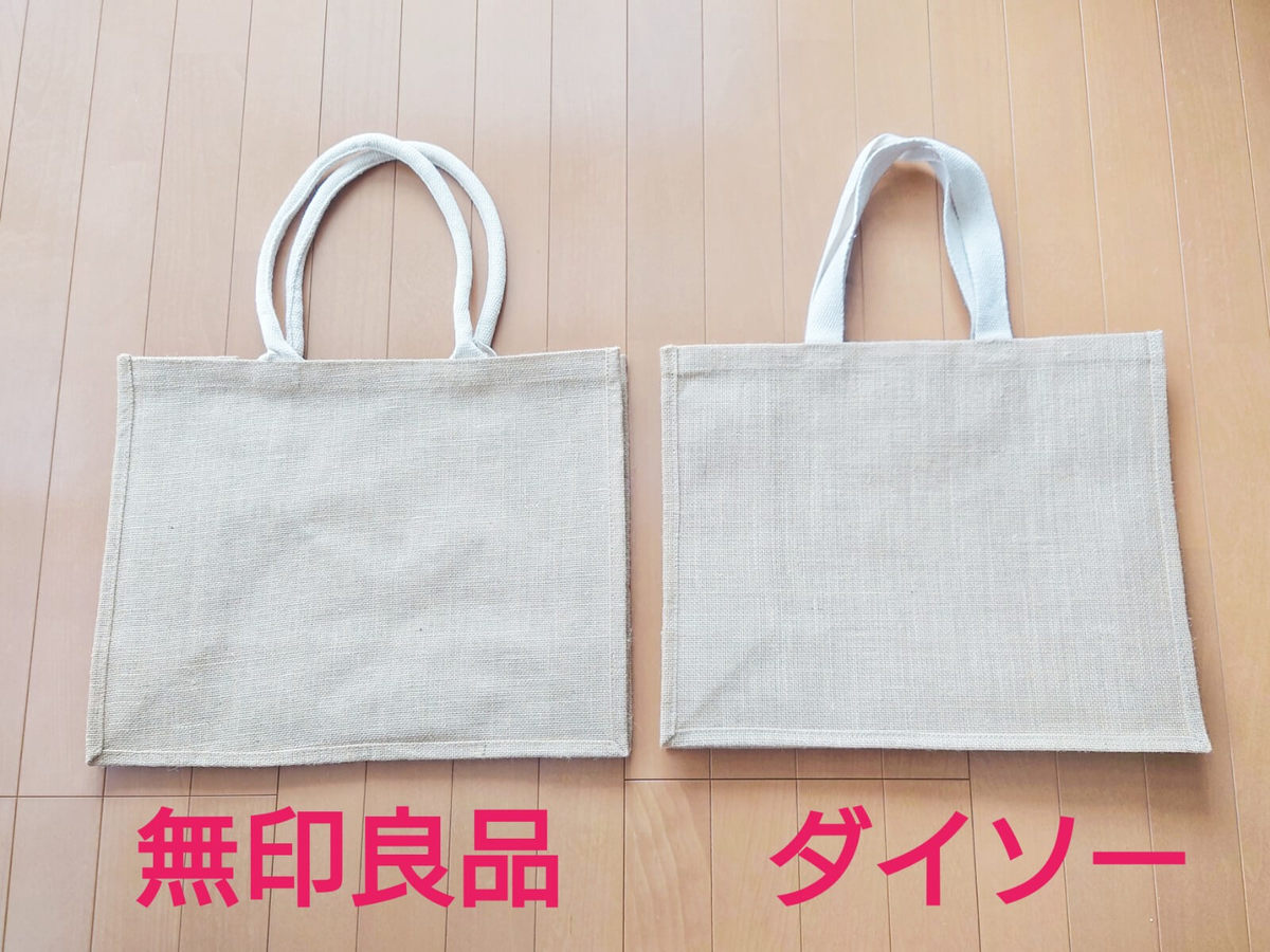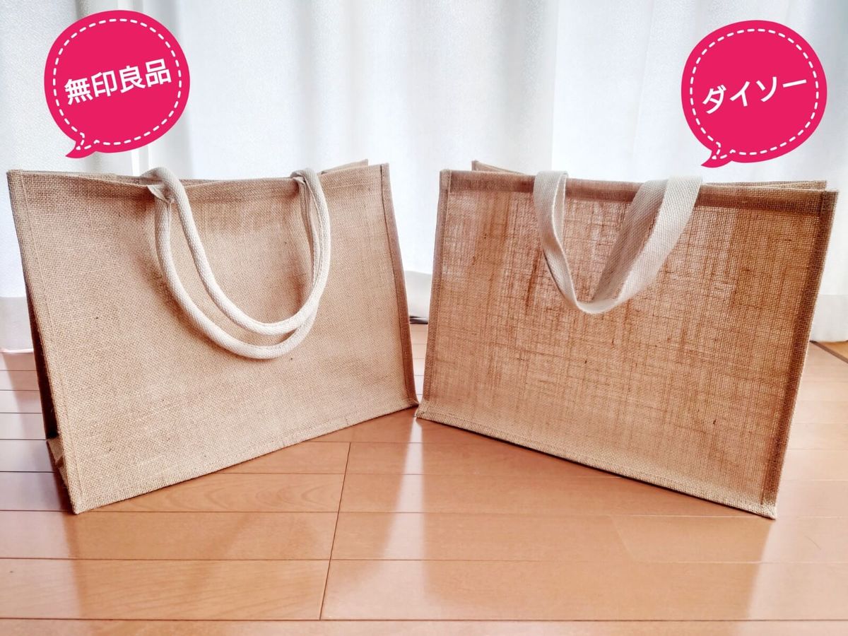 それでは、ダイソー「ジュートトートバッグ」と無印良品「ジュートマイバッグ」2つを比べてみましょう!