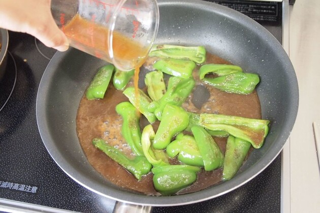 ピーマンに焼き目がついたら、混ぜ合わせておいた②の調味料を加えて、少し火を弱めて1~2分煮ます。