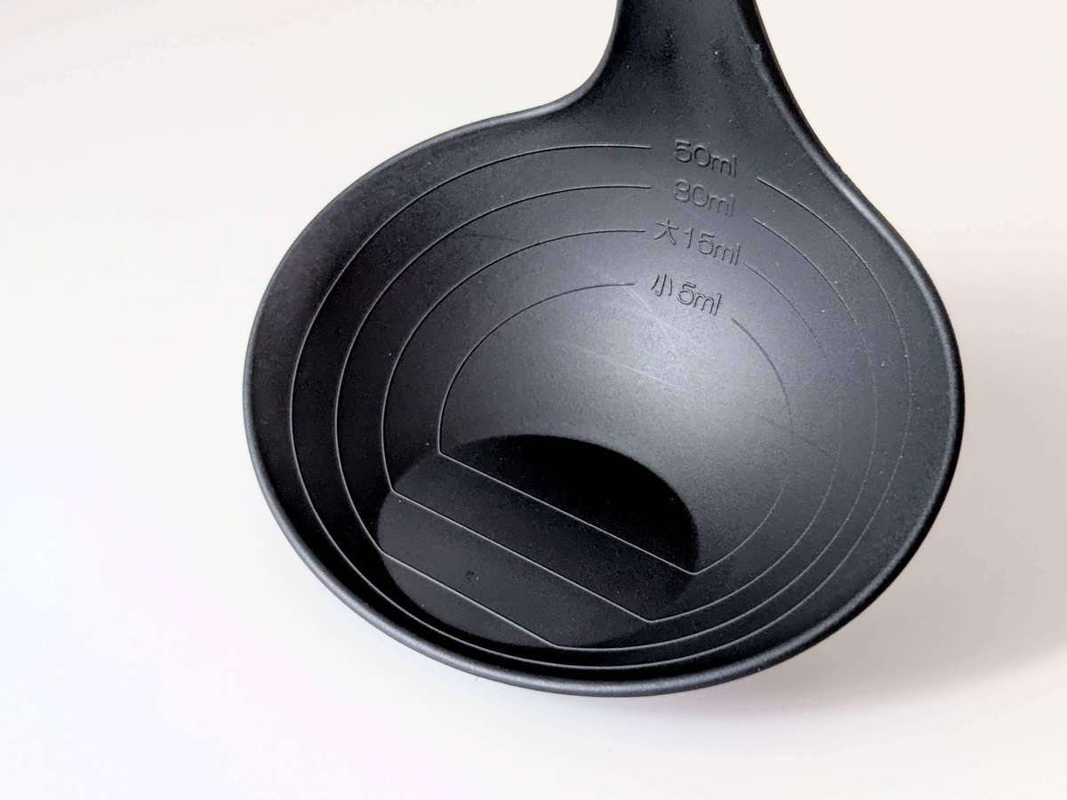 次に紹介するのは、こちらのナイロン製お玉です。 小さじ1、大さじ1、30ml、50mlと目盛りが付いていて、計量できるようになっているんです。