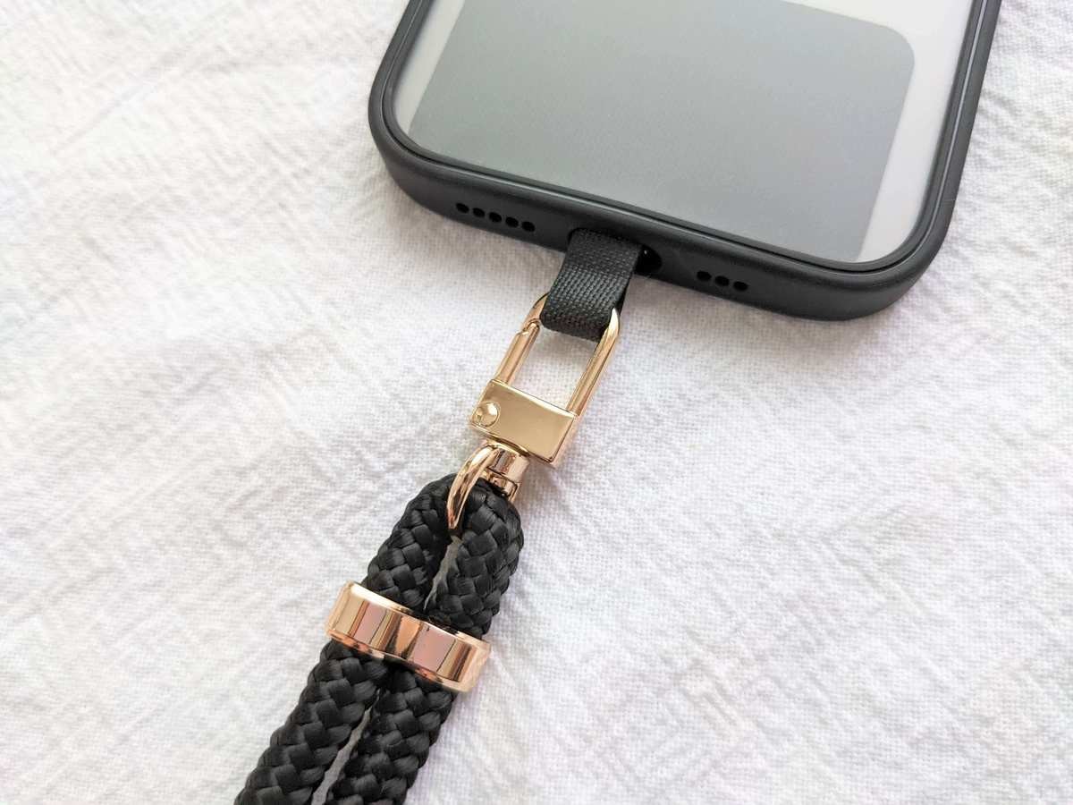 ストラップに付いている金具をホルダーに取り付けたら完成です。 フックは回転するため、首や肩にかけるときにスマホの向きは気にせずに使えます。