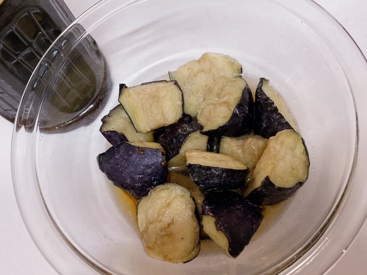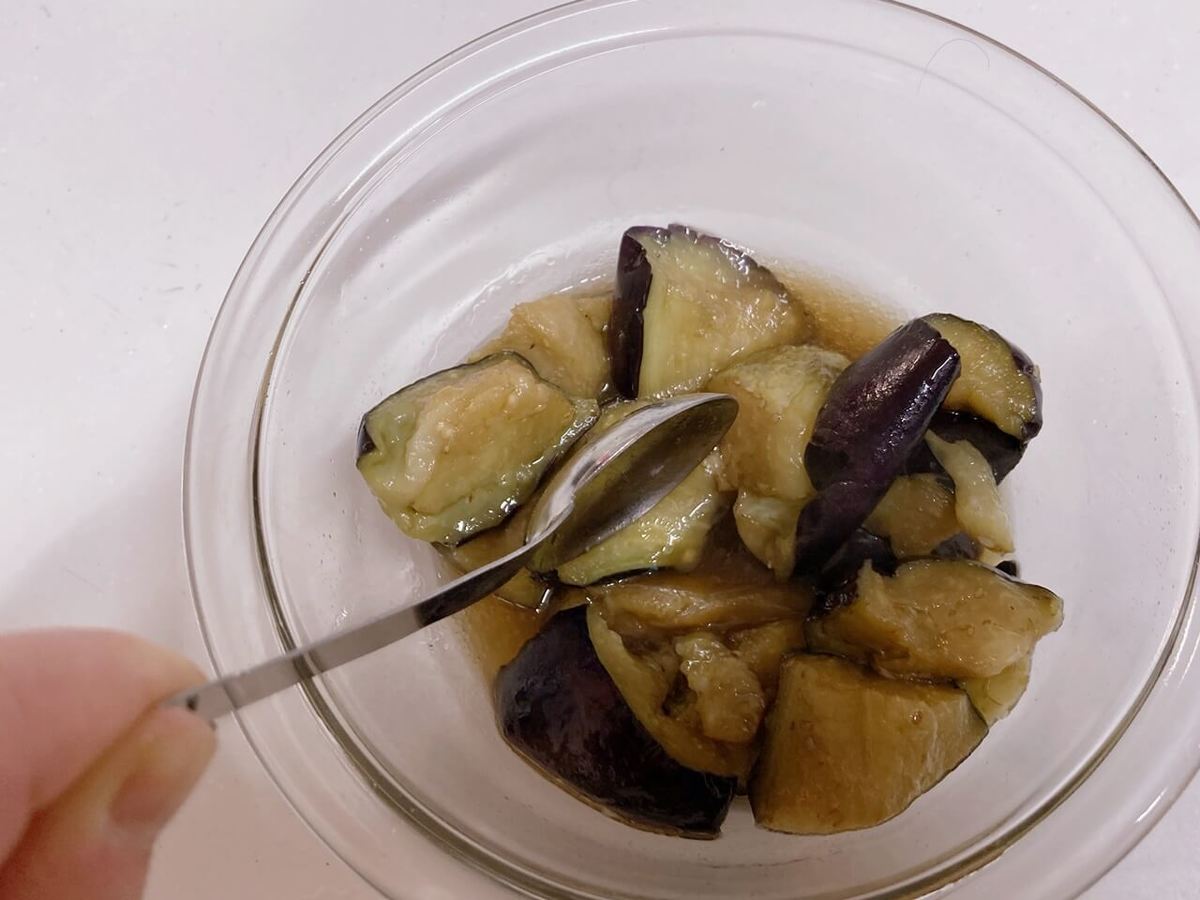 生のなすは加熱しすぎるとベチャっとなって食感が悪く、エグみが増すのが難点なんだけど、これは歯ごたえがあってとってもジューシー!
