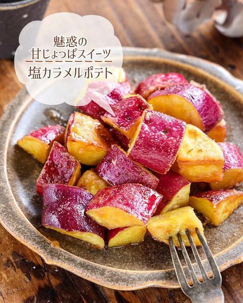一口サイズで食べやすいサイコロ型の大学芋です。サイコロ状にカットすることで、色んな角度からカリカリ食感を楽しめます。火の通りも速いので、あっという間に作れますよ。