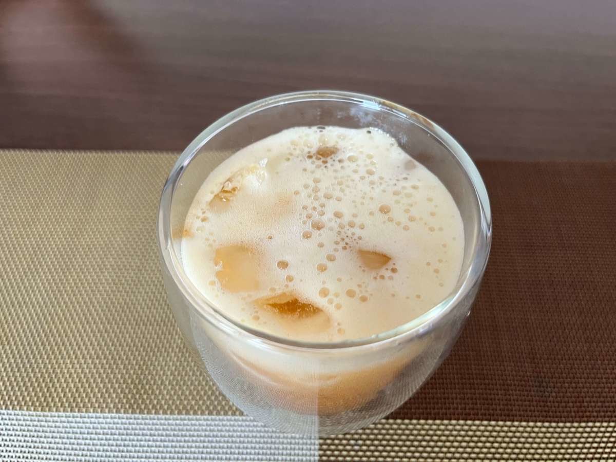 350mlのグラスにブラックティーの量は約70cc。最初は100ccほど入れたのですが、思った以上に甘いので、薄めに作った方が無難です。