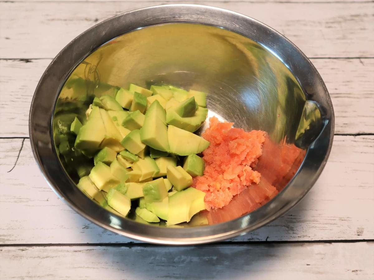 - 辛子明太子は細かく刻んで(1)のボールに入れ、お好みでチーズを入れ、しっかり混ぜる。