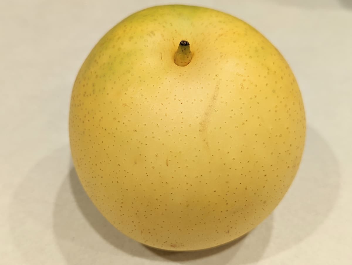 あとは「黄色いかどうか」を見てください。青梨の場合、緑っぽいものと黄色いものが売場で混在していることが多いです。黄色い方が熟度が高いので、酸味が抜けてより甘さを感じることができます。
