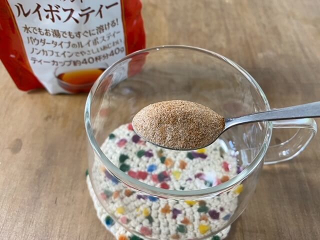 作るときの分量は、お湯または水80〜100mlに対してルイボスティーパウダーを1g(ティースプーン約1/2杯)入れます。