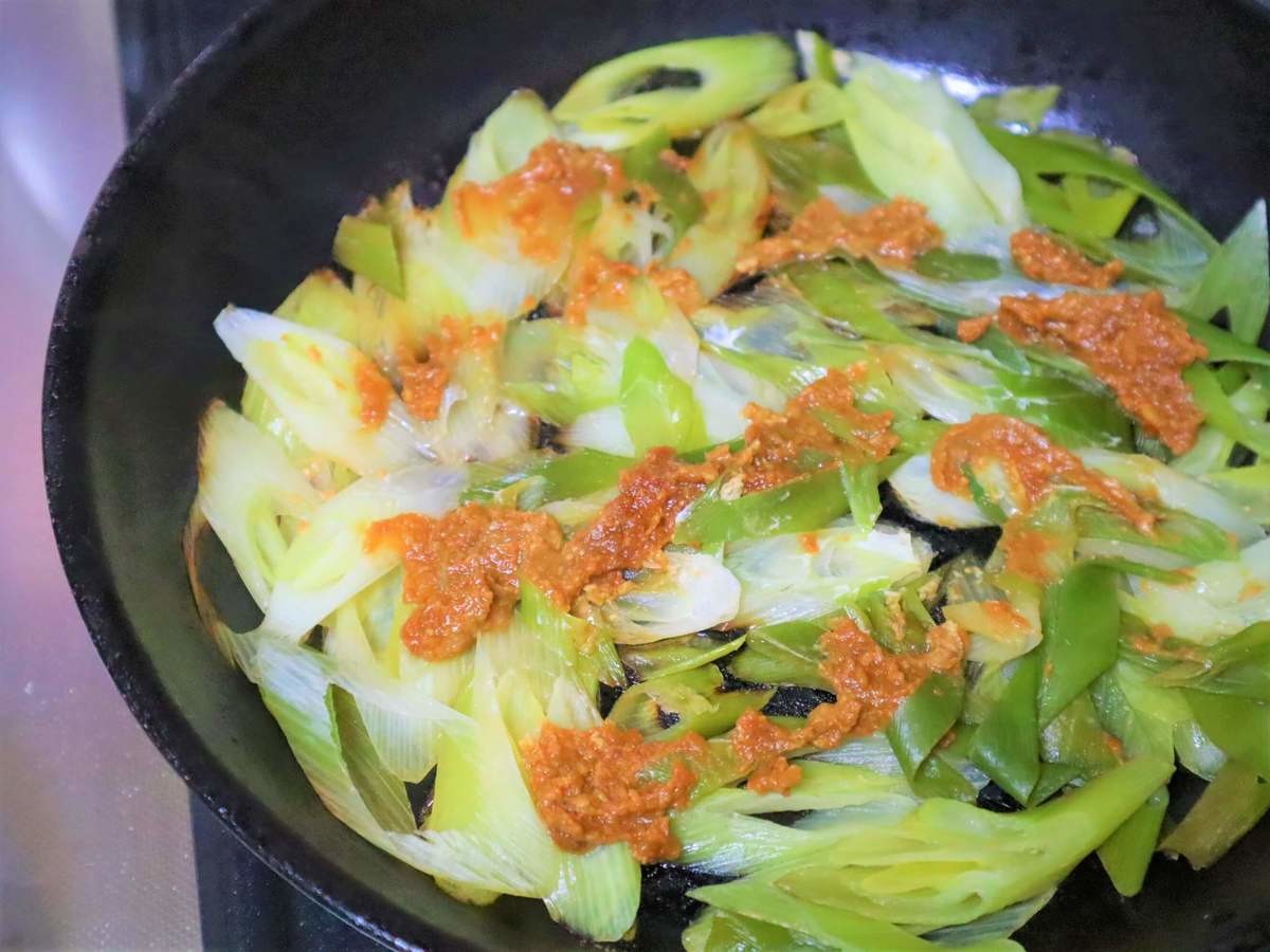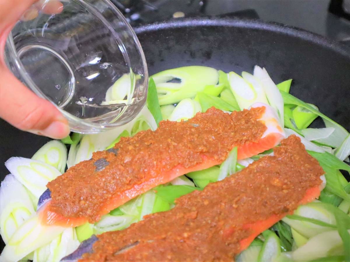 蓋を外して、1分ほど水分をとばし、鮭の上の味噌を落として鮭だけさらに取り出し、長ネギと味噌をフライパンの中で混ぜる。