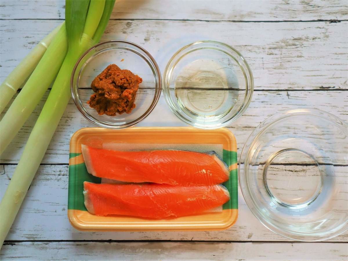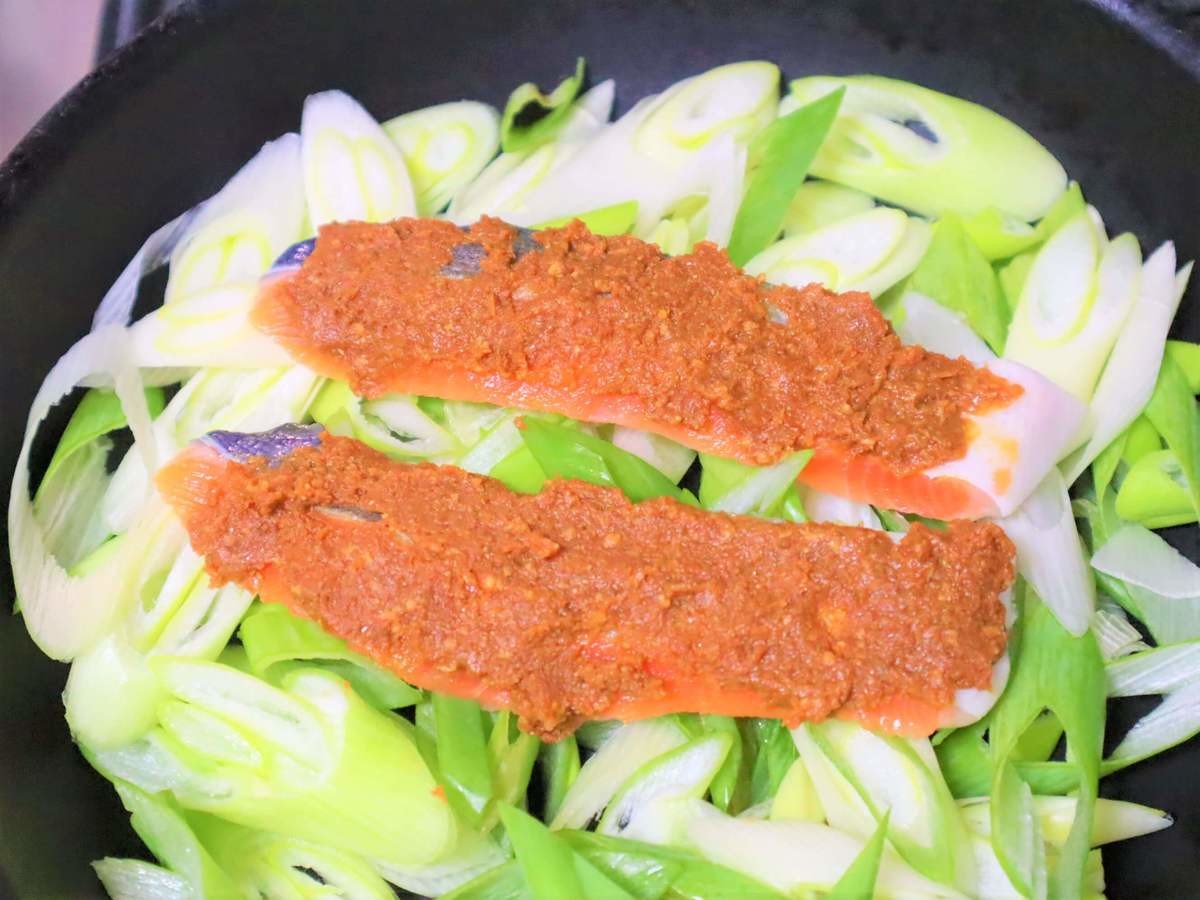 鮭の水分をキッチンペーパーでとったら、味噌を鮭の上面にぬり長ネギの上に乗せる。