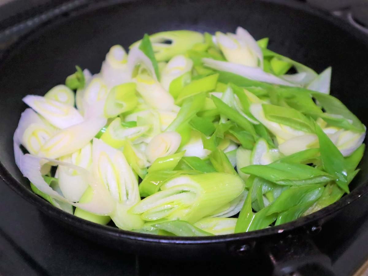 長ネギを斜め切りにしてフライパンにいれる。