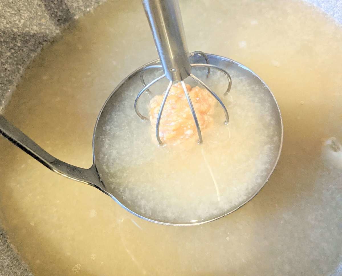 お玉の上でくるくる回すと、みそが自然に溶けていきます。 みそマドラーのおかげで洗い物も少なくなりましたし、いつもの味を作れるので本当に助かっています。