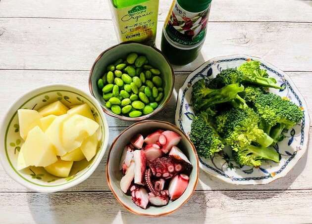 ひとり分の量にもよりますが、おおよそ3~4人分くらいの量です。茹でタコやじゃがいも、ブロッコリーはあらかじめ食べやすい大きさにカットしておきます。