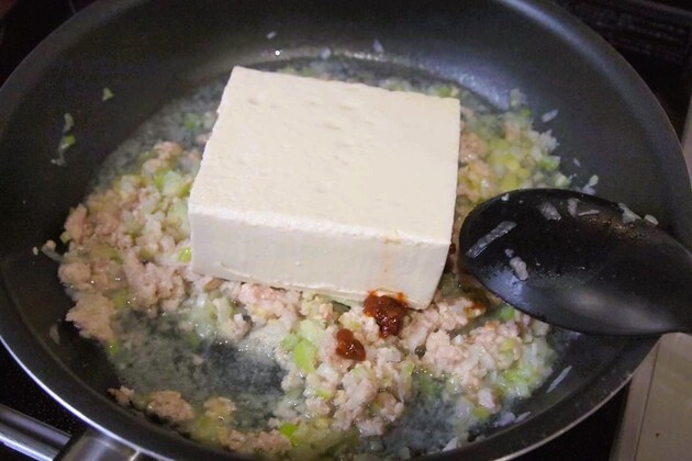 麻婆豆腐の作り方③豆腐、調味料を入れる