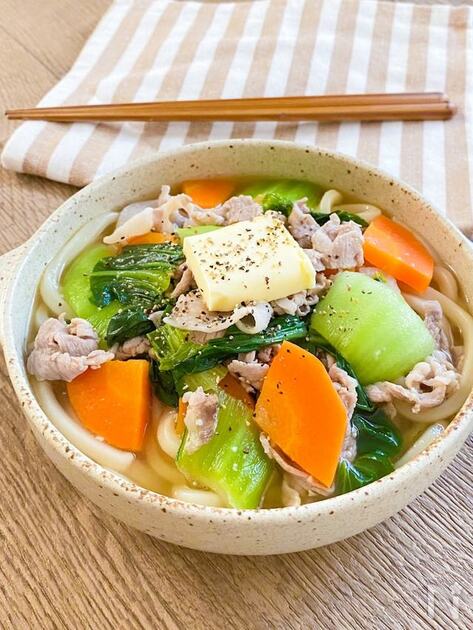 間違いない美味しさ!食べ盛りの子供もメンズウケも良しのスタミナうどんです。ニンニクとバターの香りがたまりません。お野菜もたっぷり摂れるので、野菜不足を解消したい時にもオススメ。(調理時間:10分)