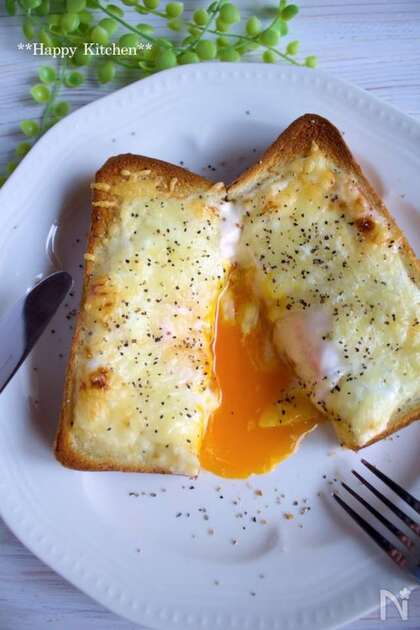 カルボナーラ風に仕上げた、食べ応え満点のトーストです。とろ〜り卵とコク旨チーズが相性抜群で、一口食べたら止まらない美味しさ。とろとろのたまごを絡めながら召し上がれ。