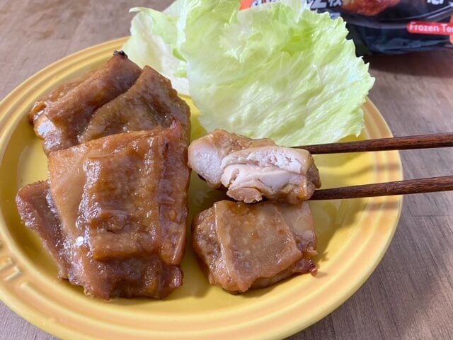 一切れパクッと食べてみると、お肉の甘みと照り焼きの甘辛く付けられた味付けで次々と食べたくなるほど美味しい♪