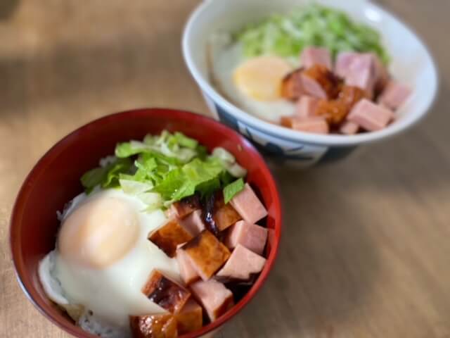 焼豚をお好みのサイズに角切りにカットします。後は目玉焼きとレタス、カットした焼豚を乗せて完成♪