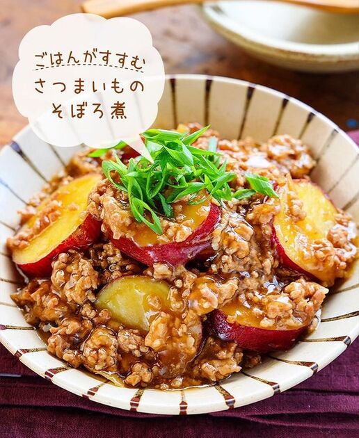 さつまいもでご飯が進む甘辛いおかずがこちら。豚ひき肉のそぼろをさつまいもと一緒に甘辛く煮込んでいます。隠し味に入れた生姜で爽やかな風味をプラス。ほくほく甘いさつまいものおいしさも感じつつ、しっかりとおかずの味わいです。
