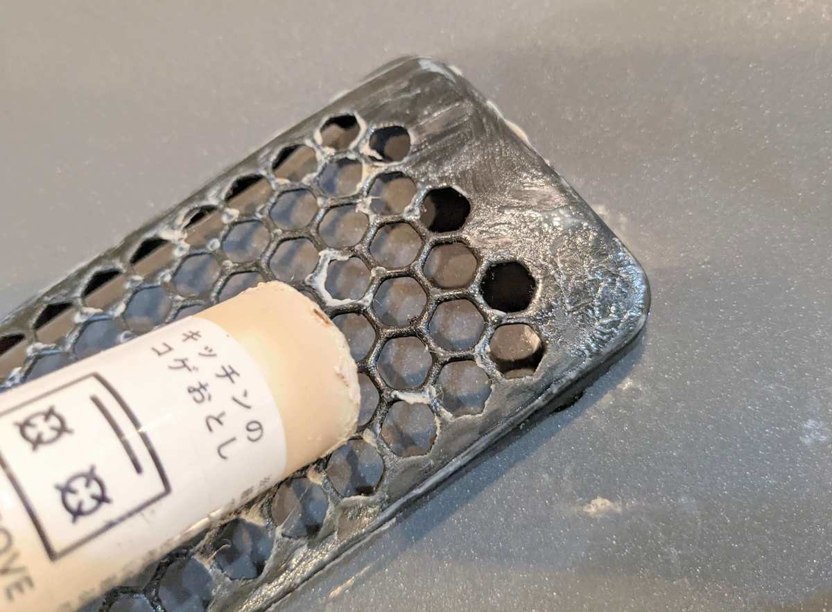 油まみれの排気口パネルも、くるくる優しくこするだけで汚れが落ちていきます。 スティックの先端部分が汚れてきたら、湿らせた雑巾などで拭き取れば繰り返し使えます。